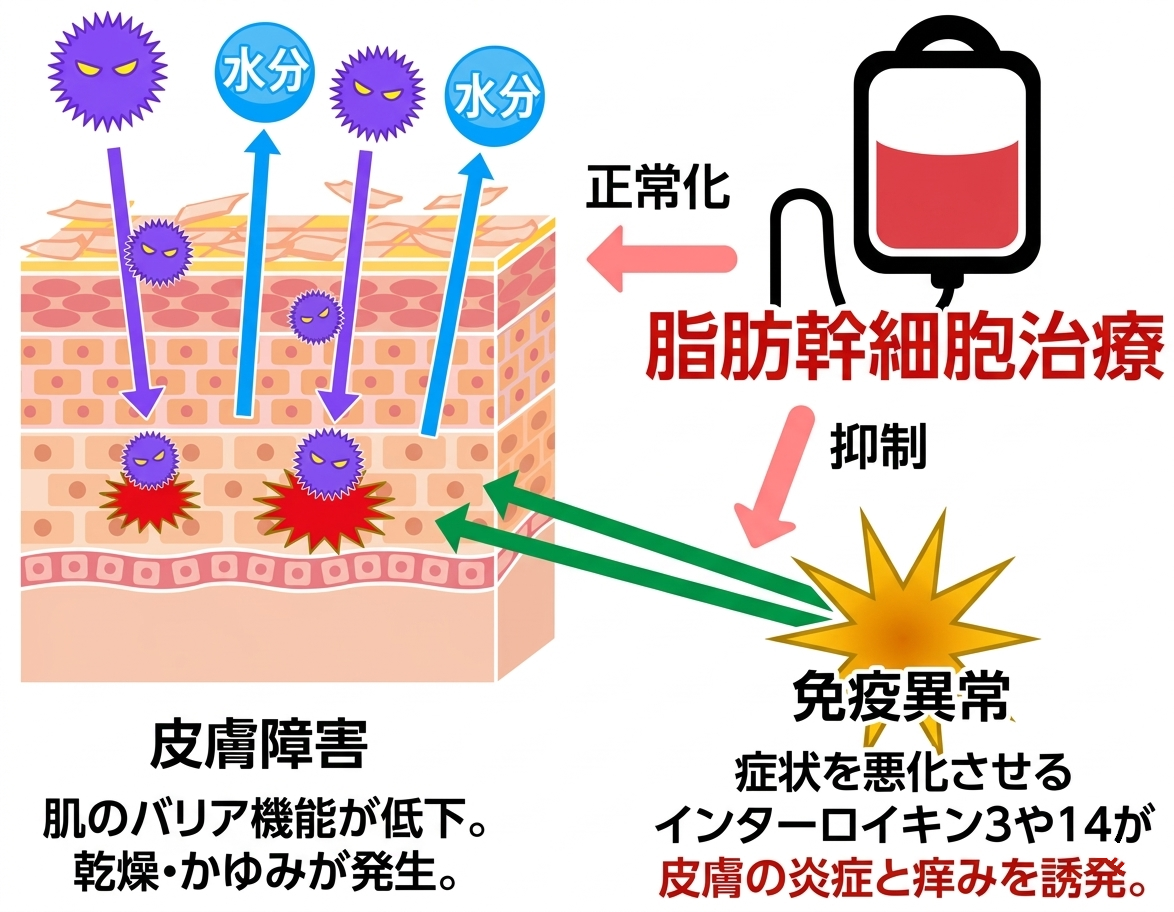 静脈内に投与された脂肪幹細胞は免疫機構に作用することで、皮膚の炎症と痒みを誘発する様々なサイトカインの出現を抑えることが証明されています。